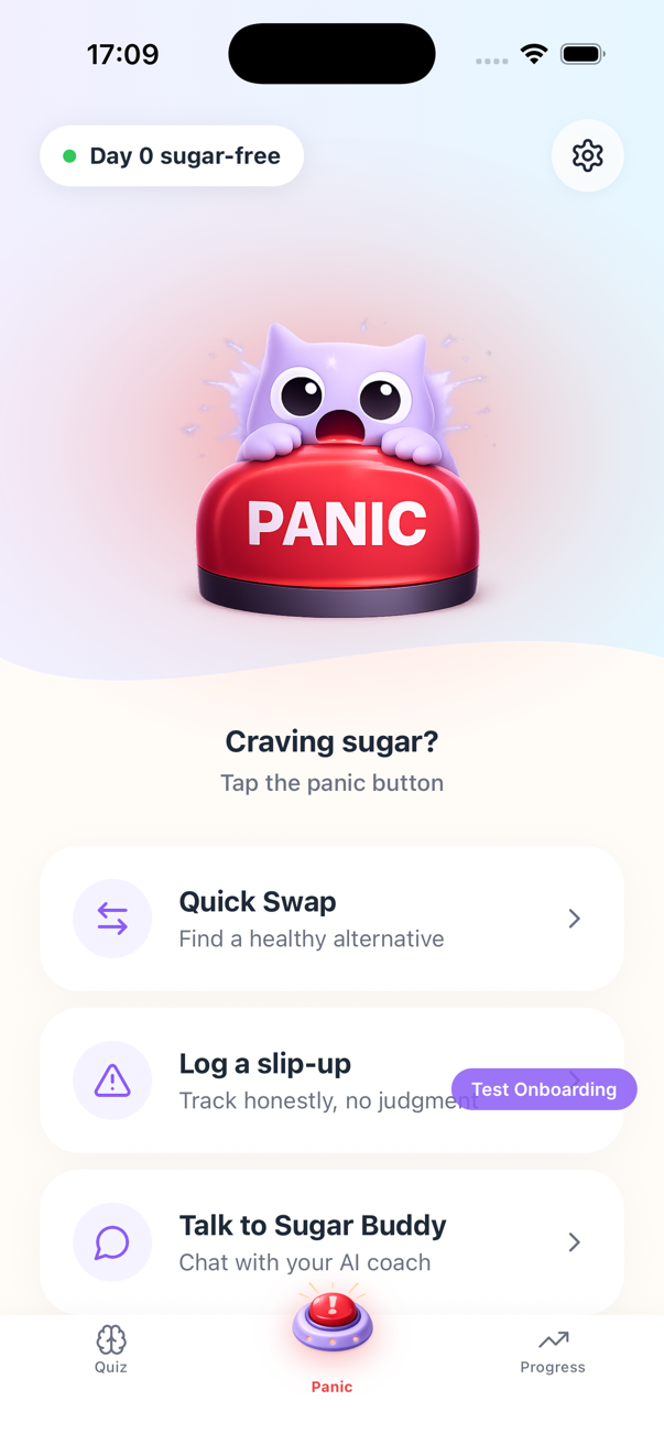 Track your sugar-free streak, wins, slip-ups, and grams avoided — without judgment.